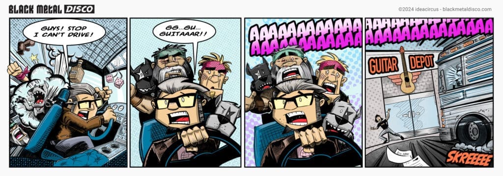“The Crash” (6 of 10) These first comics have been more “action and story” than stupid jokes. But how many bus crashes have there been in rock and roll history? Well, maybe ten that I can think of. So, here’s another one.