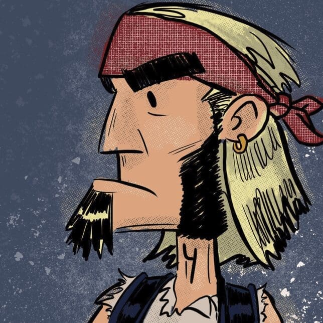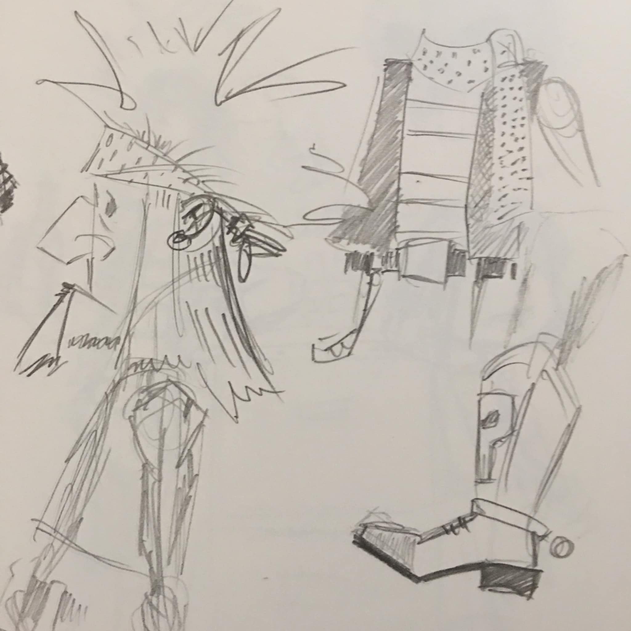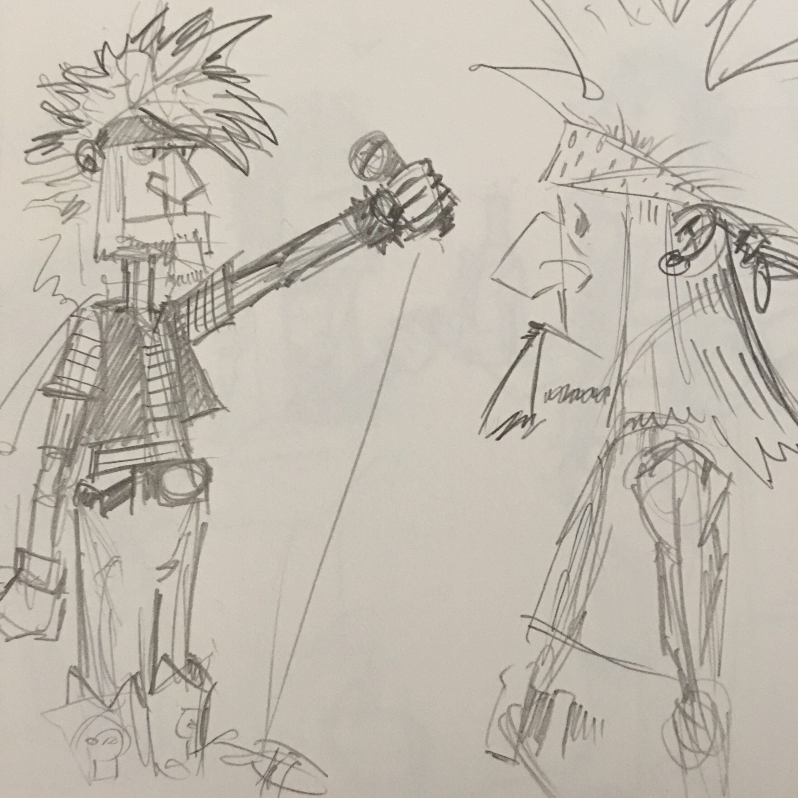 He’s stupid fun to draw, and I haven’t quite nailed down his outfit, but that will change over time. He’s wirey and in shape for an old rocker, and his hair has thinned out over time. See example.